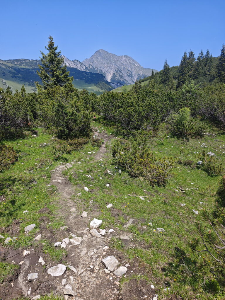 Der Abstieg erfolgt auf dem gleichen Weg. Der Rückweg über die Felsbänder zum Vorgipfel erfordert nochmals volle Konzentration. Nach dem Übergang wird der Weg zunehmend leichter. An der Plumsjochhütte kann man nochmals einkehren, bevor man über den Aufstiegsweg zurück zum Ausgangspunkt bei den Haglhütten wandert. Die Plumsjochhütte ist der ideale Ort zur Einkehr nach der anspruchsvollen Tour. Mit ihrer gemütlichen, urigen Atmosphäre bietet sie eine wohlverdiente Stärkung. Wer es ruhig mag und dem Trubel entfliehen will, findet hier genau das Richtige – einfache, ehrliche Küche, freundliche Hüttenwirte und eine traumhafte Aussicht auf das Karwendel. Außerdem eignet sich die Hütte hervorragend für eine Übernachtung, um die Tour zu entzerren oder am nächsten Tag weiter zur Mondscheinspitze aufzubrechen. Alternativ kannst du am nächsten Tag auf auf den Kompar. So wird aus einer fordernden Tagestour ein genussvolles, alpines Wochenende mit viel Natur und wenig Menschen.