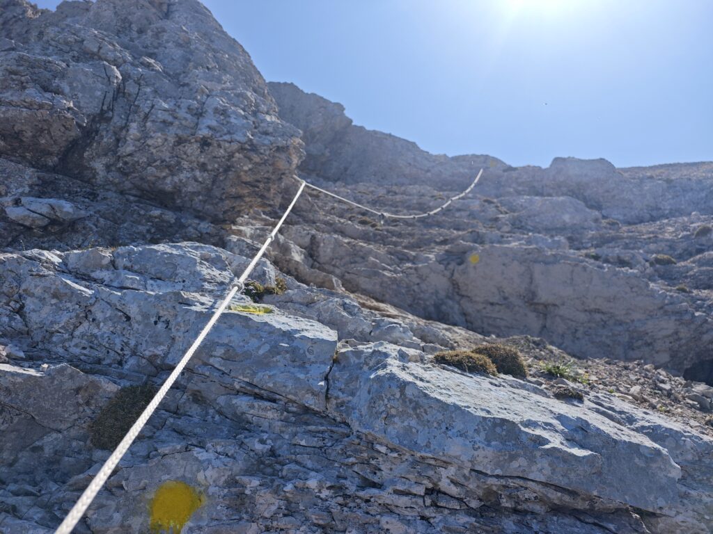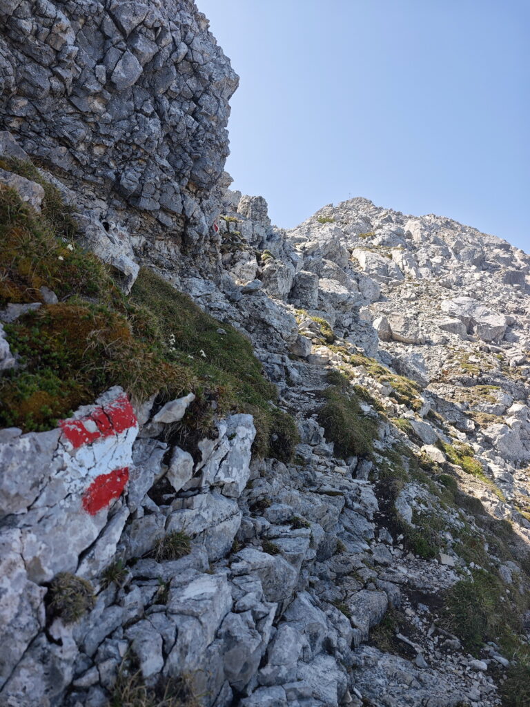 Wer sich den Hauptgipfel der Bettlerkarspitze zutraut, sollte nun besonders aufmerksam sein. Der Steig verliert sich teilweise in kaum sichtbaren Pfadspuren. Verblasste Markierungen in Rot und Gelb sowie Steinmanderln weisen den Weg – doch der Pfad führt nun in deutlich anspruchsvolleres Gelände. Man folgt der Route in westlicher Richtung unterhalb des Gipfelgrates. Mehrere Felsbänder müssen gequert werden, teils mit leichter Kletterei (UIAA I–II). Das Gelände ist stellenweise abschüssig und ausgesetzt, mit losem Gestein und brüchigen Stellen – absolute Trittsicherheit, Klettergewandtheit und Schwindelfreiheit sind hier unverzichtbar. Die Schlüsselstelle der Tour ist eine etwa 3–4 Meter hohe Felsstufe, die mit einem Seil gesichert ist. Dieses erleichtert den Aufstieg.
