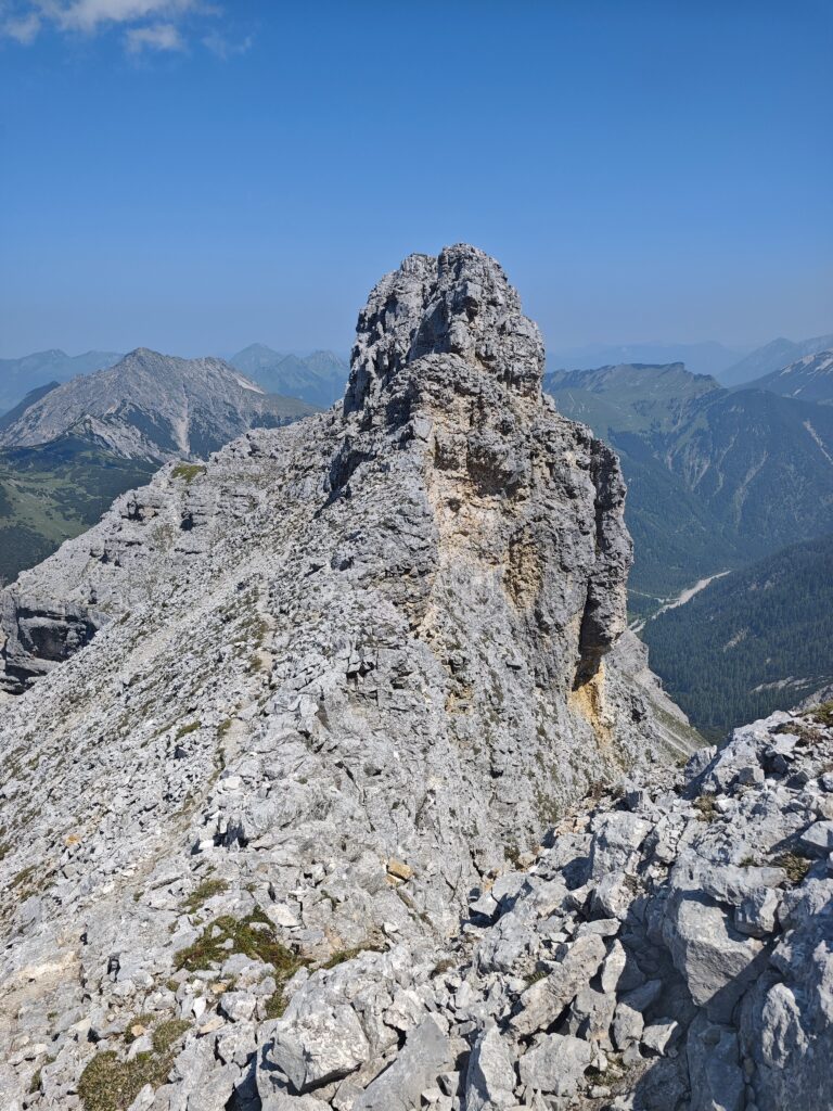 Über den markierten Steig kommst du zum Vorgipfel der Bettlerkarspitze. Der Ausblick ist unglaublich schön. Unten siehst du die grüne Wiese der Plumsjochhütte, die vom steinernen grauen Gipfel der Mondscheinspitze überragt wird. Rundherum sind die anderen prominenten Gipfel des Karwendel. Wer noch Kraft hat und schwindelfrei wandern kann, sollte noch den Steig zum eigentlichen Gipfel der Bettlerkarspitze in Angriff nehmen.